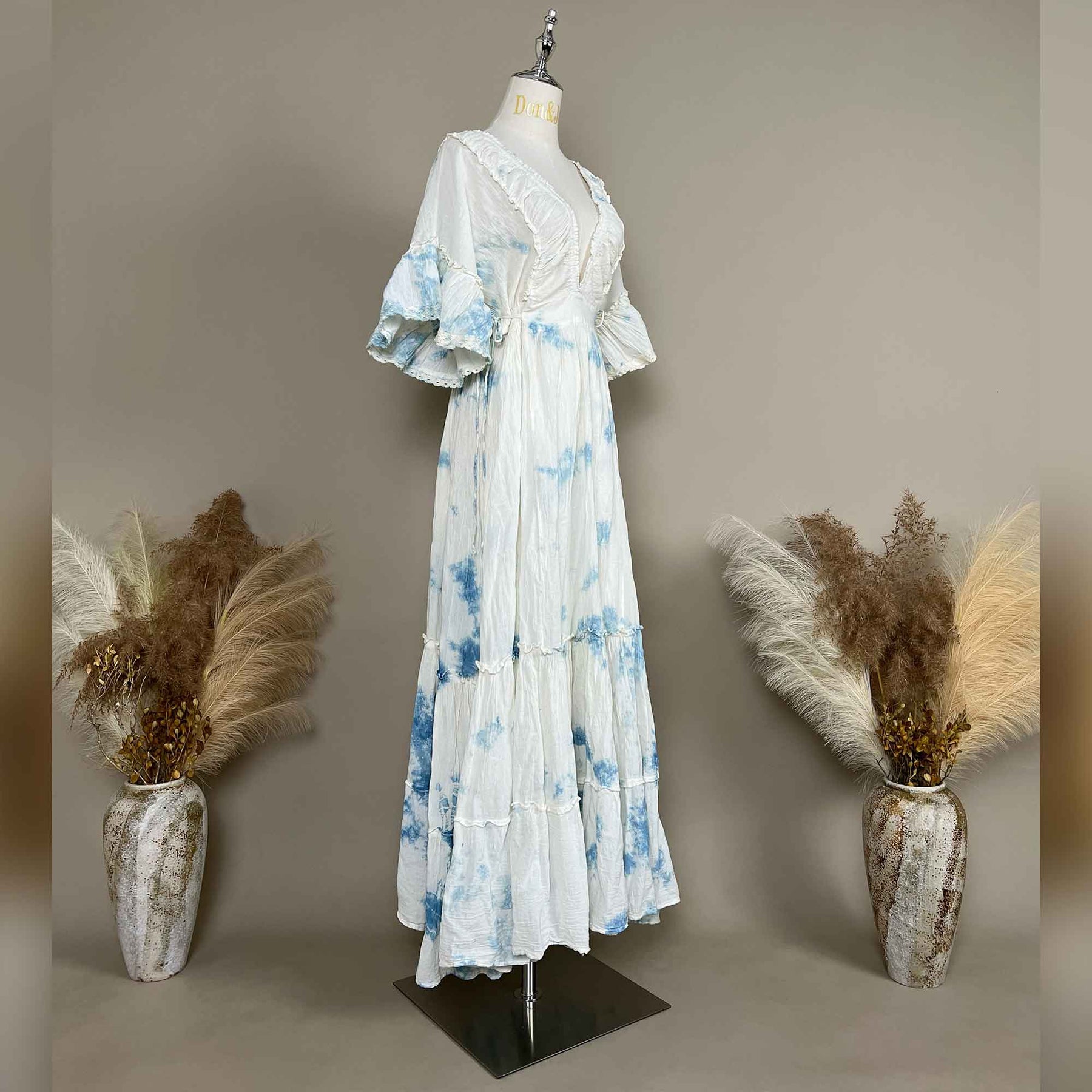 Tie-Dye Crinkle Cotton V-Neck Short-Sleeve Maxi Dress Maternity Gown Pregnant Dress Photoshoot Baby Shower