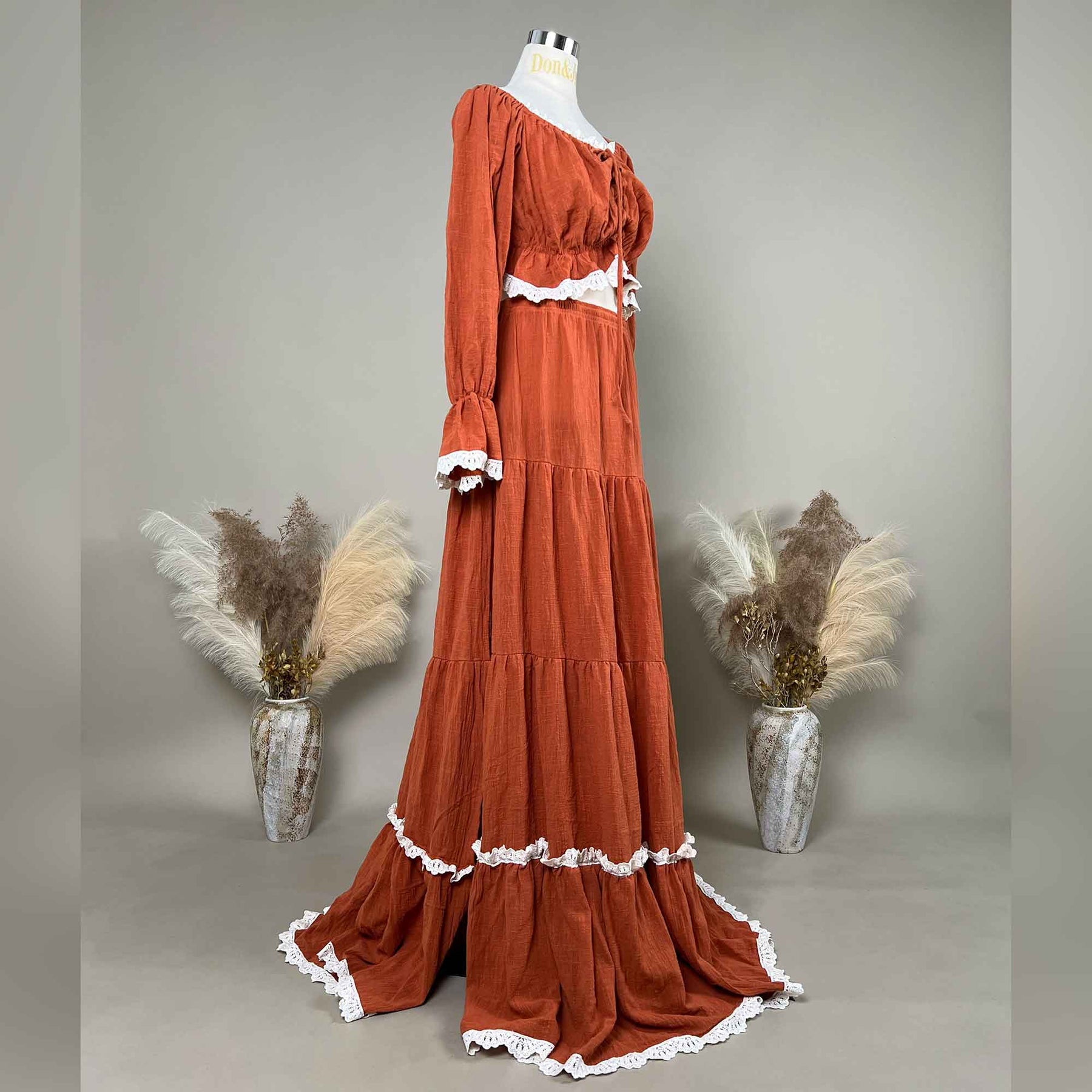 Product name: Cotton-Linen Trimmed Hem Long Sleeve Two-Piece Set Maternity Gown Pregnant Dress Photoshoot Baby Shower