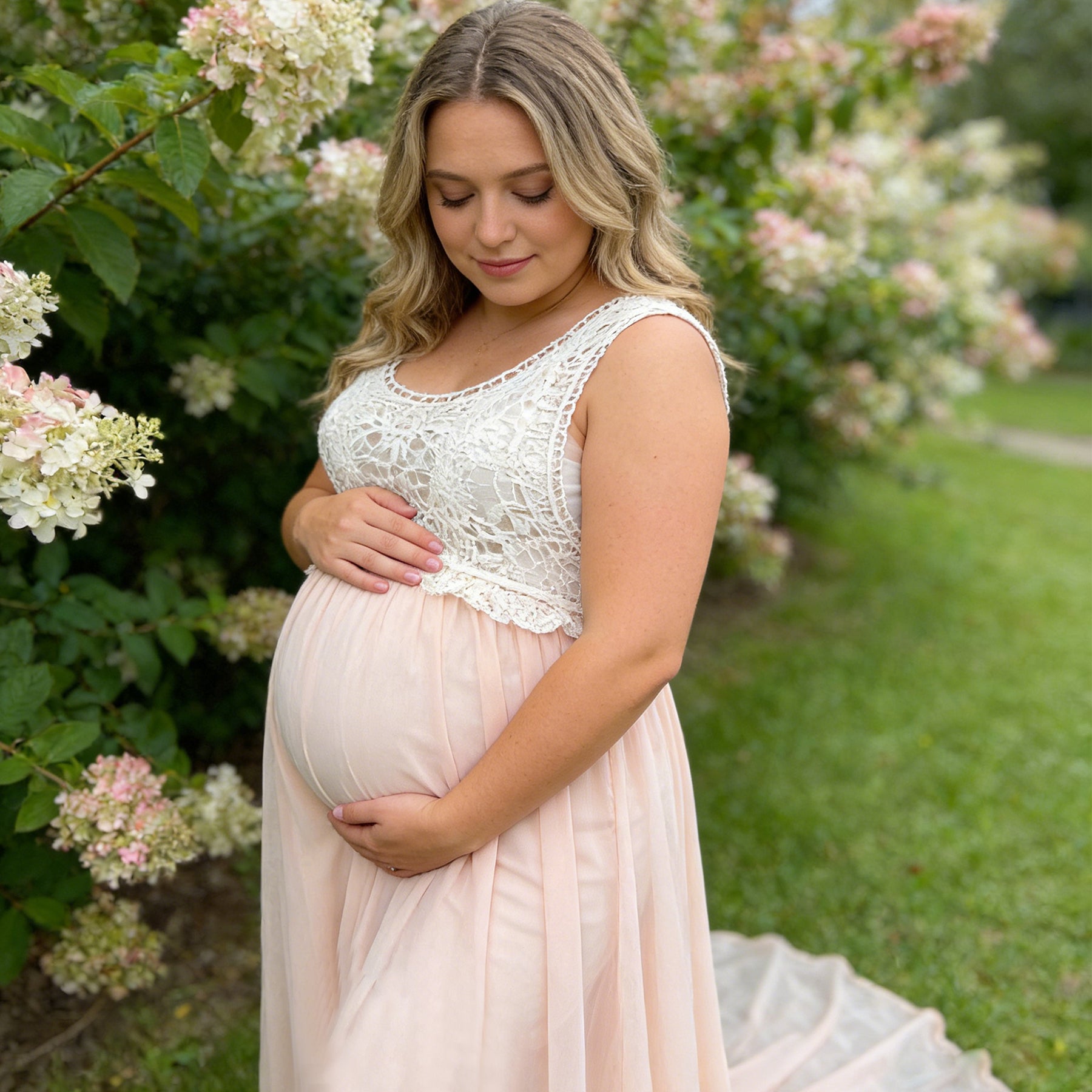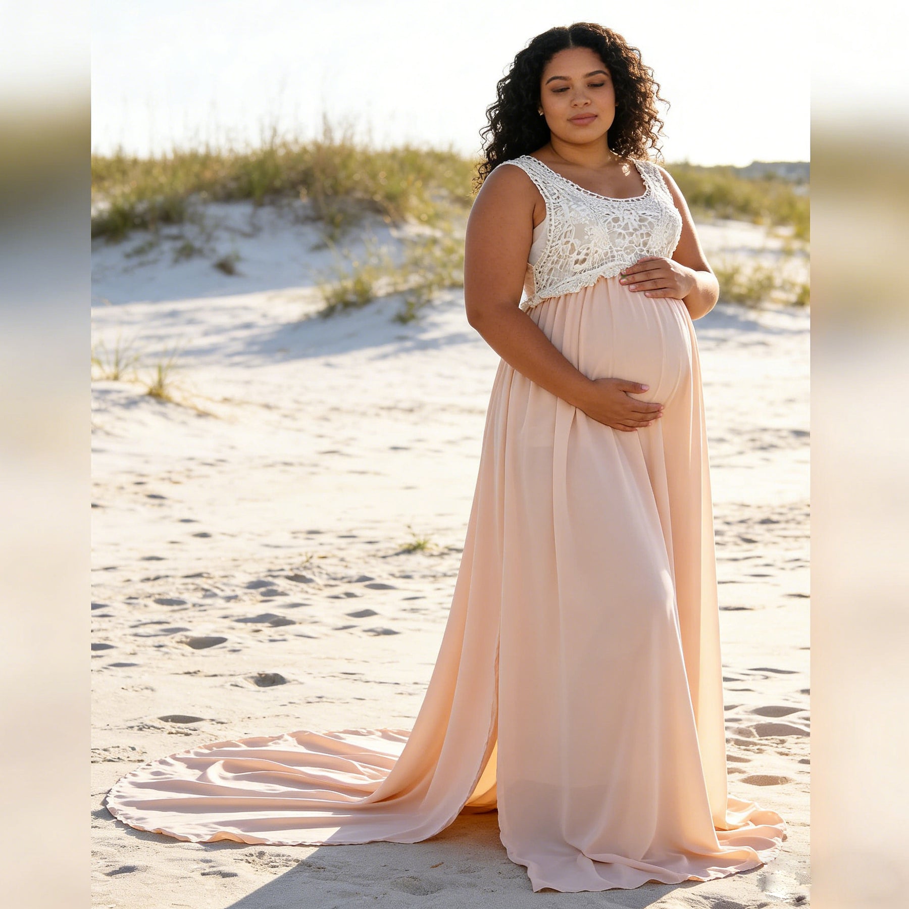 Product name:Nude Pink Chiffon Slip Dress with Floral Appliqué Dress Gown for Photoshoot Baby Shower