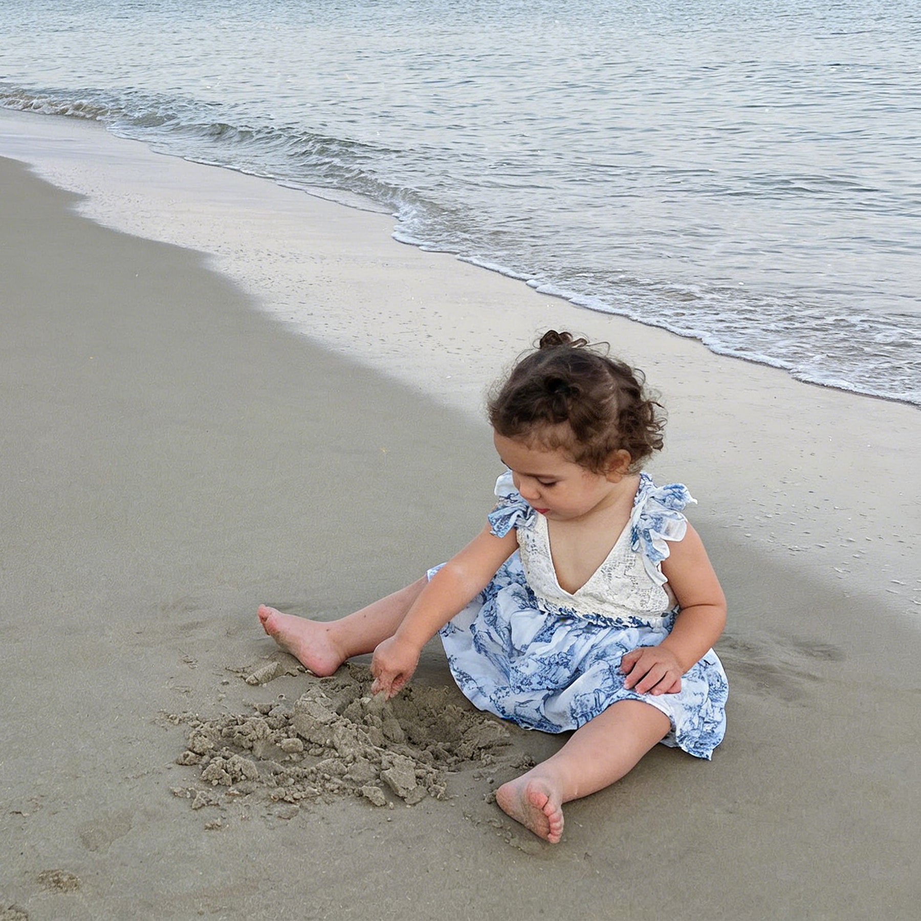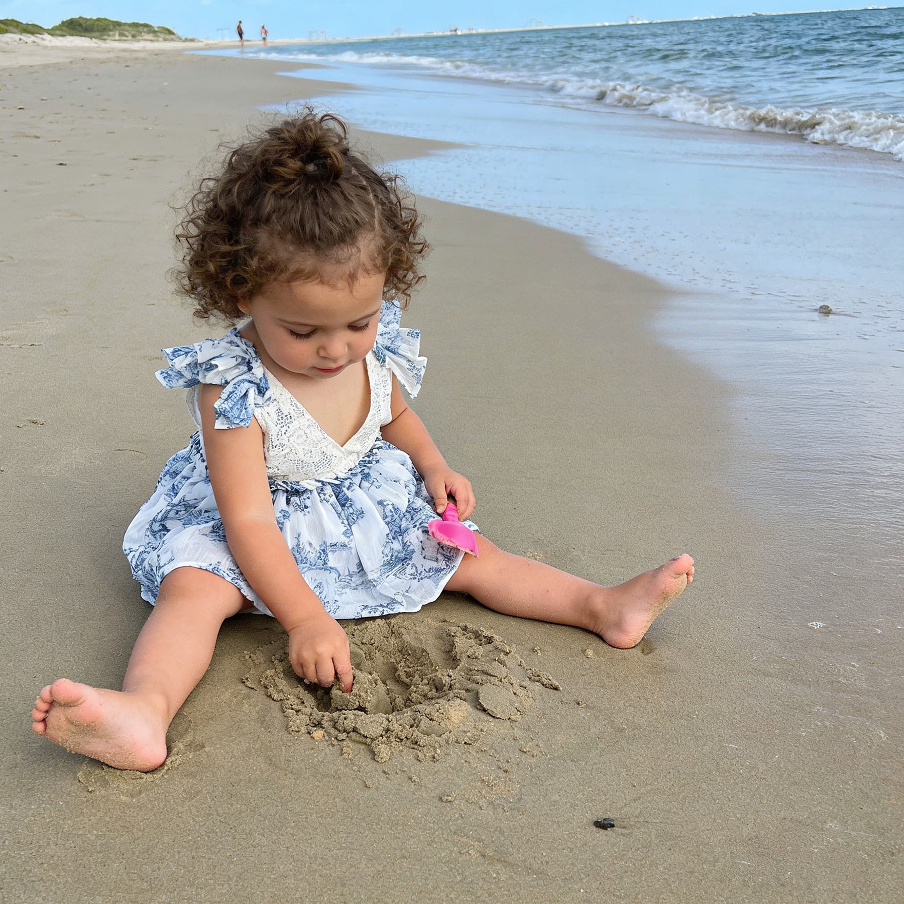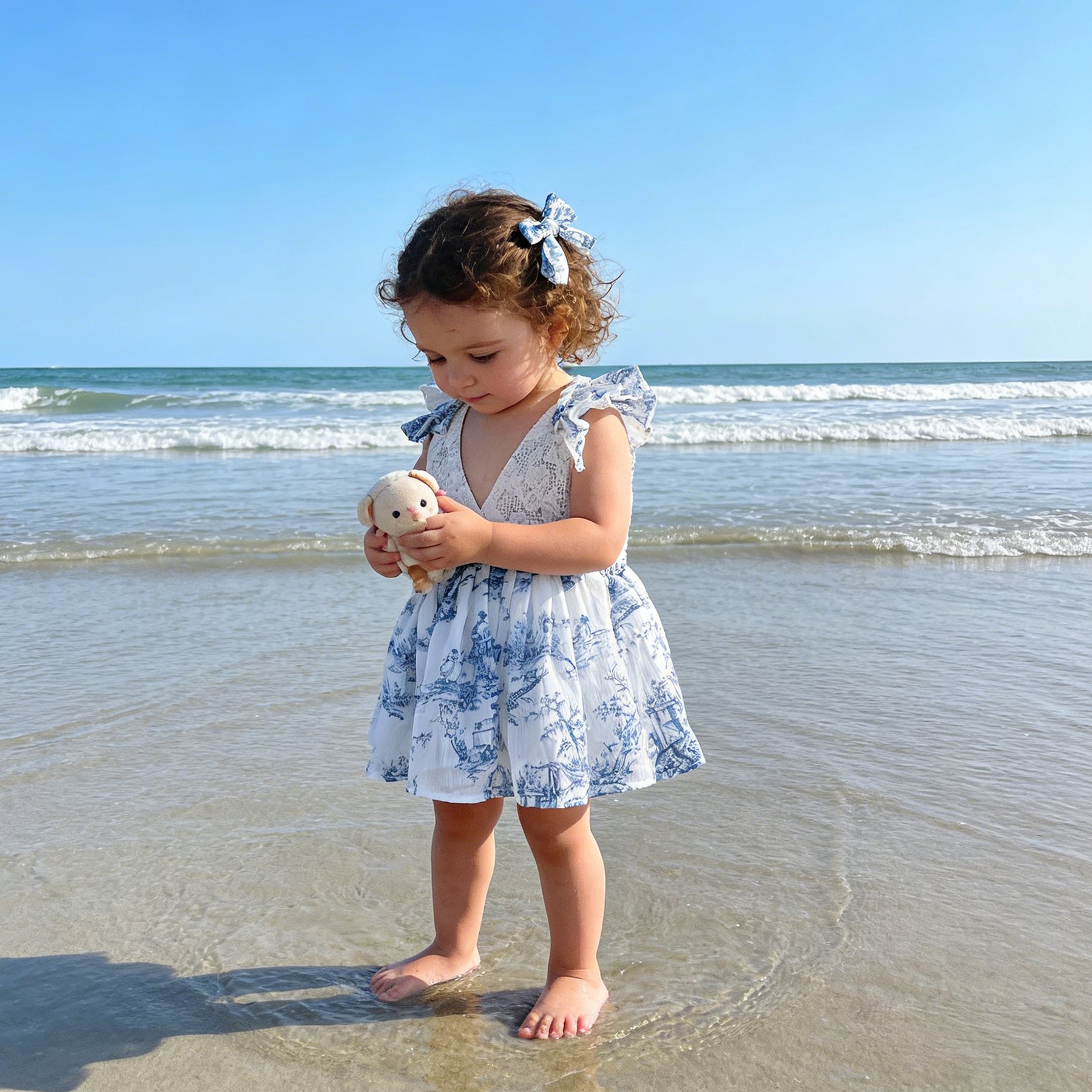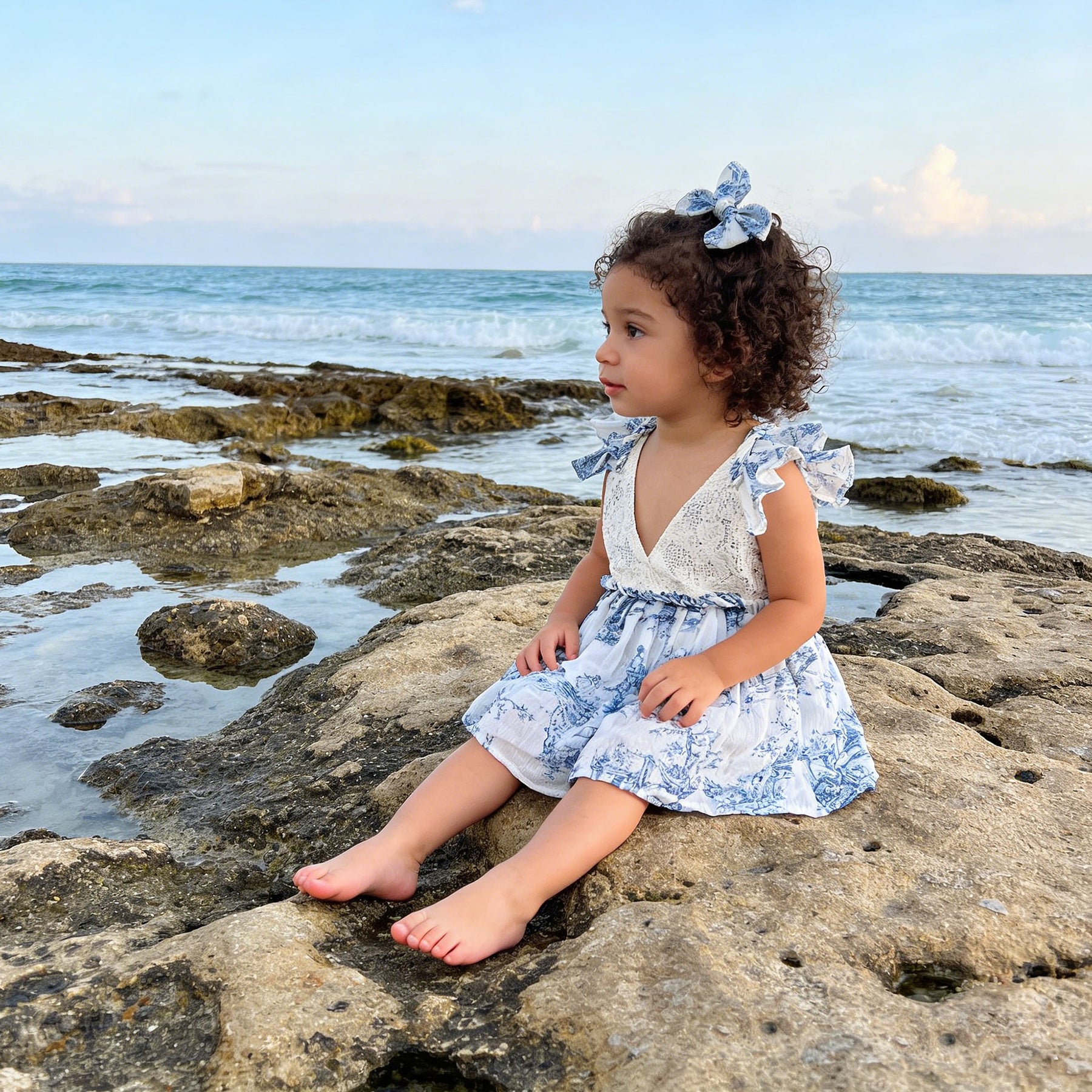 Product name:White Crochet Lace Romper with Blue Toile Print Ruffle Sleeves V-Neck Backless Dress Gown for Photoshoot Baby Shower