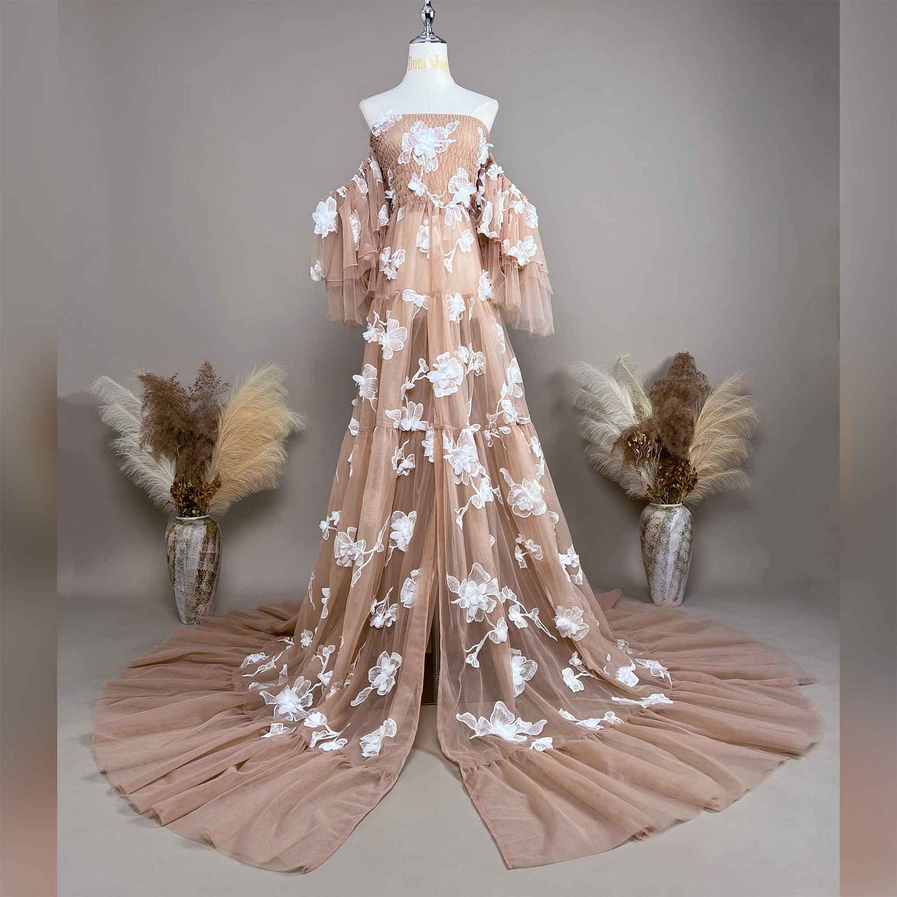 Product name: Khaki Mesh 3d White Floral Embroidered Strapless Dress With A Slit At The Chest-Maternity Gown for Photoshoot Baby Shower
