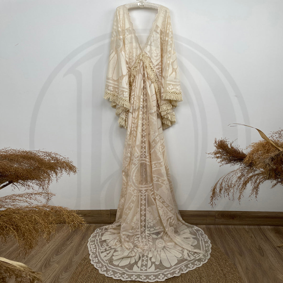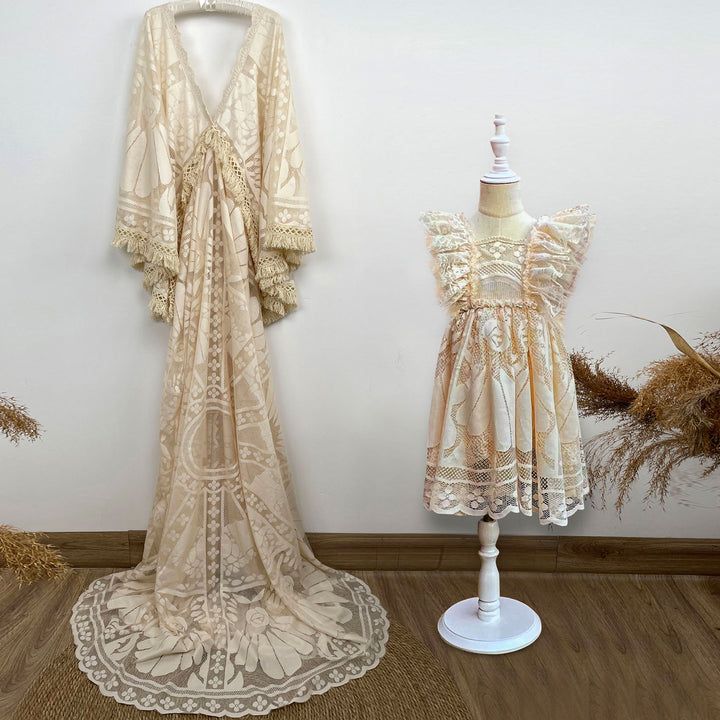 Product name: Beige Boho Lace Mommy Gown with Matched Little Gilrs 3-6years Old Dress Set Pregnancy Photography Dresses Bohemia Maxi Gown Photo Shoot Prop