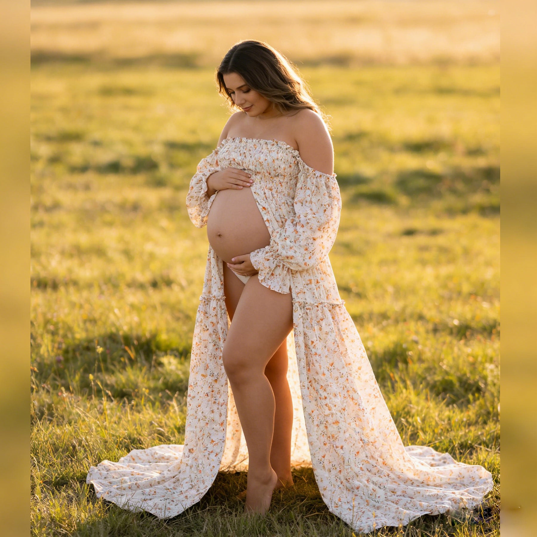 Product name: Floral Chiffon Strapless Long-sleeved Front Slit Maternity or Non-maternity Dresses for Photography Props Baby Shower Photo Props