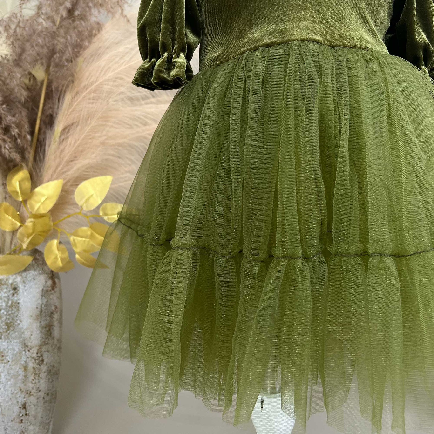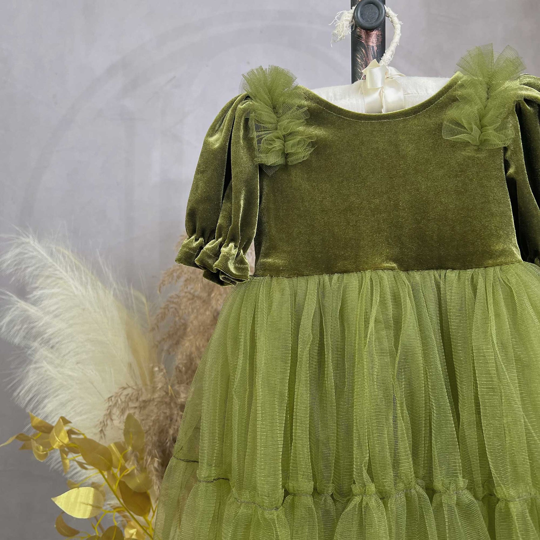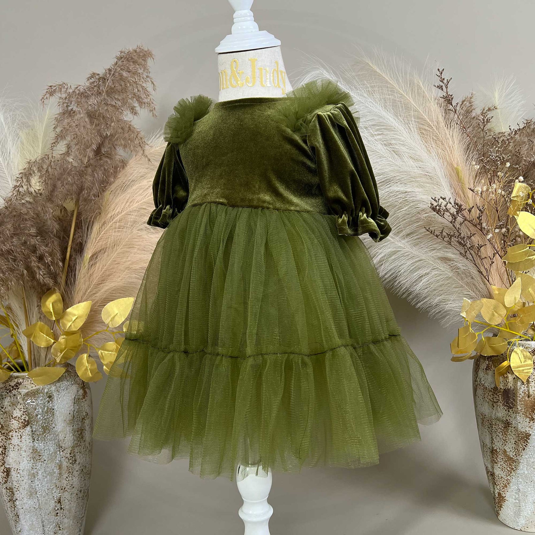 Product name: Olive Velvet Puff Sleeve Three-layer Tulle Gown 1-6years Little Girls Dress for Photo Shoot Props Photography Accessories
