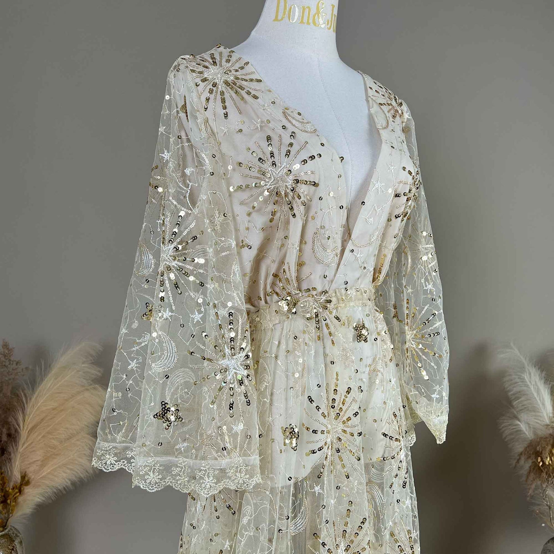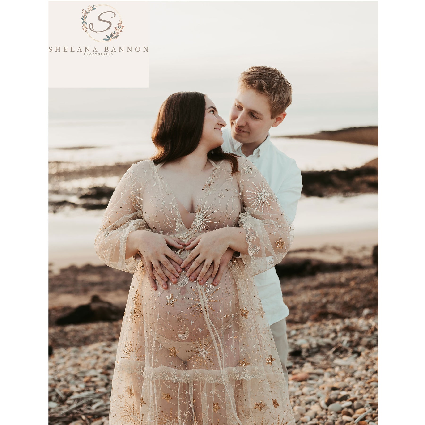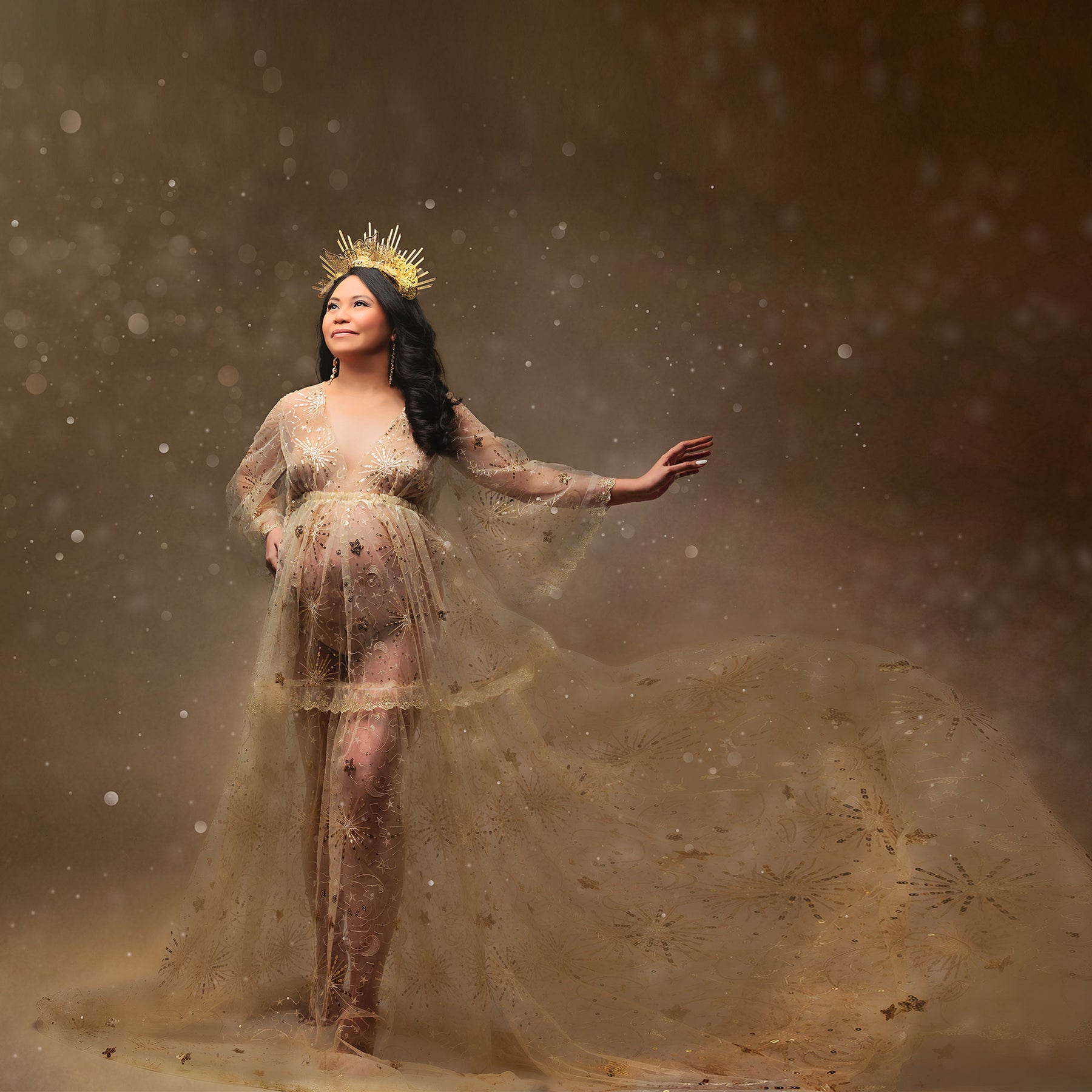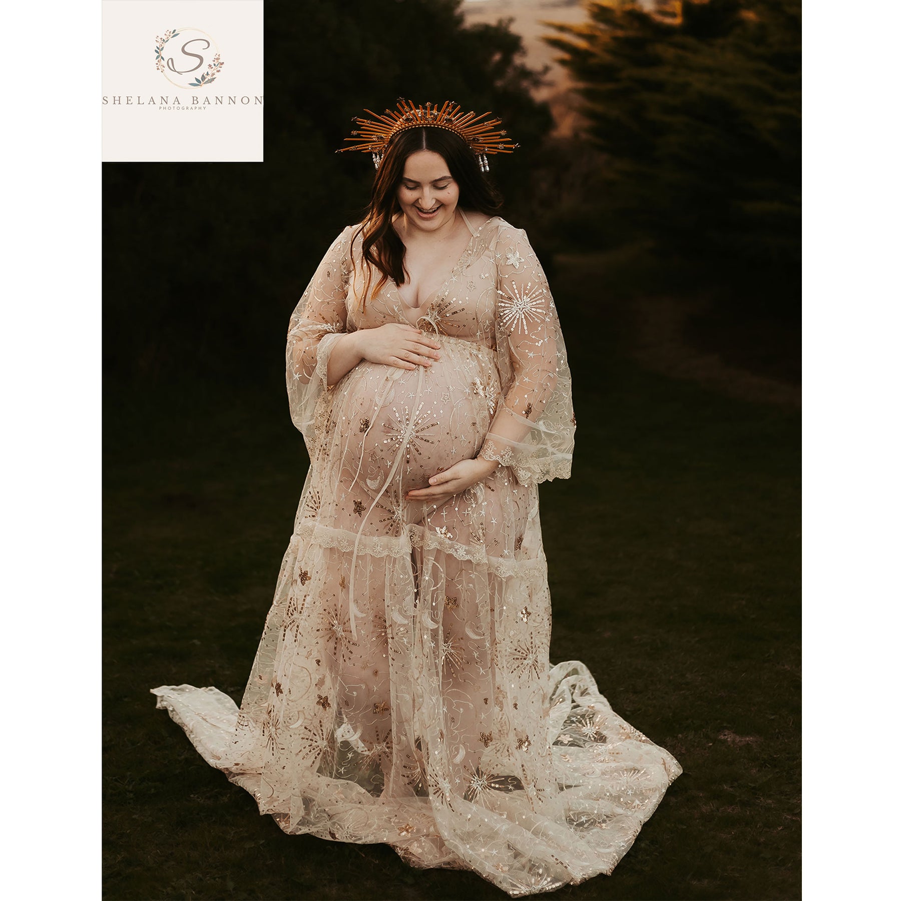 Product name: Gold Free Size Boho V-neck Long Sleeves Sequence Dress Maternity Gown Photography Dress Party Dresses Baby Shower Photo Props Kaftan Robe Maternity Couture Pregnancy Clothes for Woman Photo Shoot with Embroidery Moon and Star