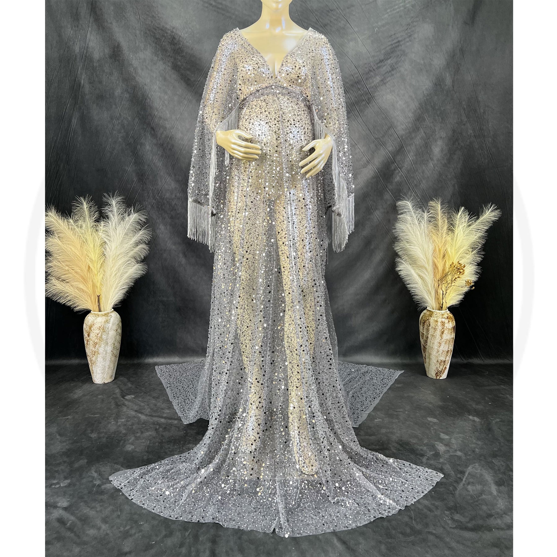 Product name: Christmas Free Size Boho V-neck Long Sleeves Sequence Dress Maternity Gown Photography Dress Party Dresses Baby Shower Photo Props Kaftan Robe Maternity Couture Pregnancy Clothes for Woman Photo Shoot with Embroidery Pearl