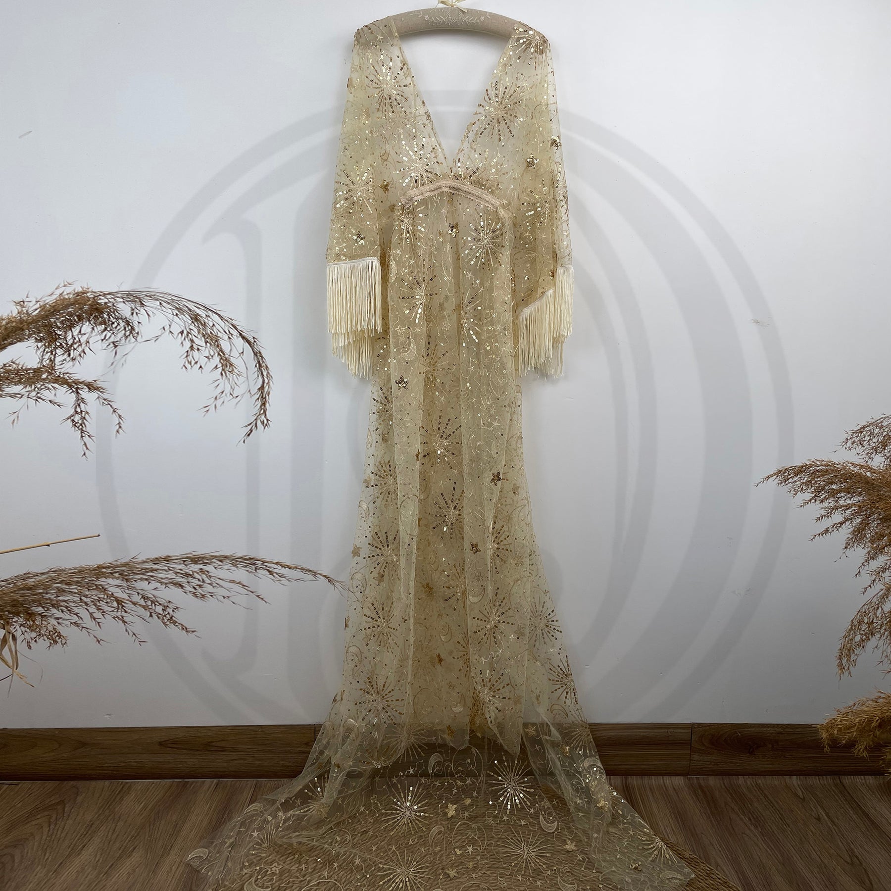 Product name: Sequence with Embroidery Moon and Star Mommy Gown with Matched Little Gilrs 9-24 Month and 3-6years Old Dress Set Boho Dress Pregnancy Photography Dresses Bohemia Maxi Gown Photo Shoot Prop