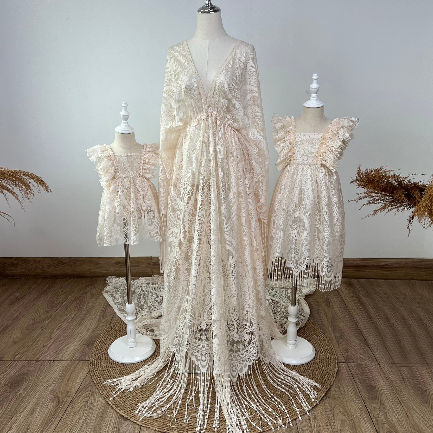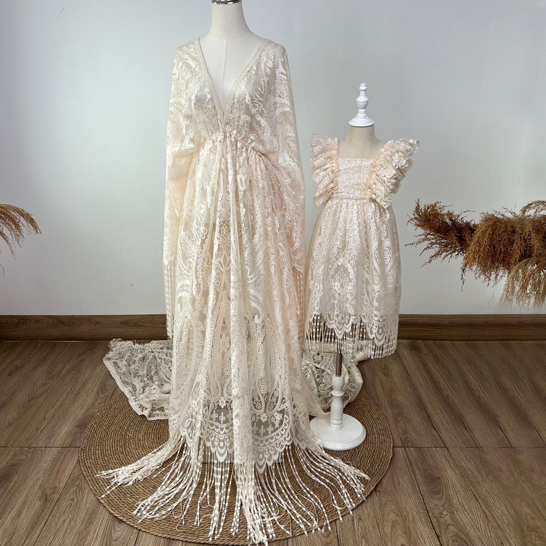 Product name: Boho Lace Mommy Gown with Matched Little Gilrs Dress Set Pregnancy Photography Dresses Bohemia Maxi Gown Photo Shoot Prop