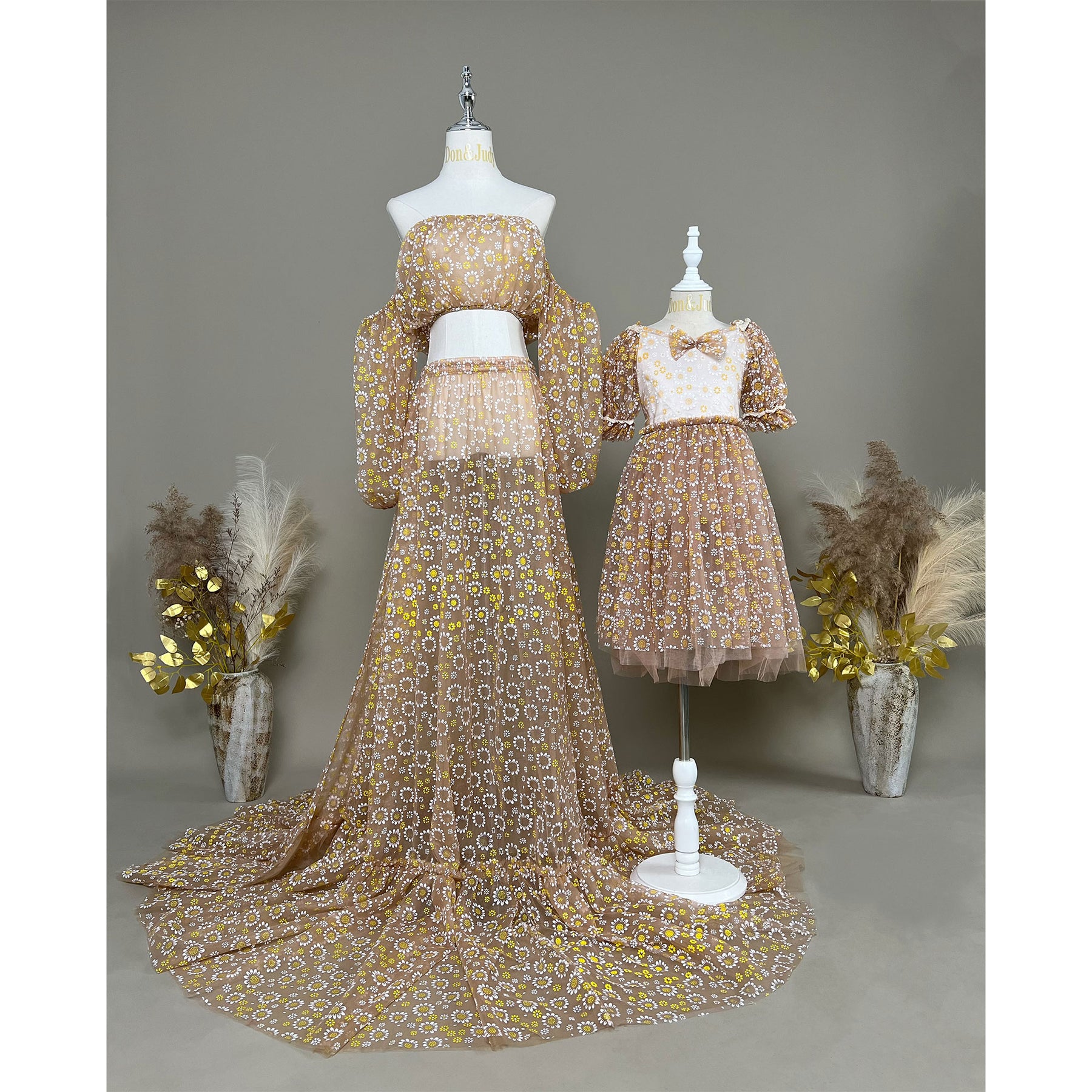 Product name: Daisy Flower Mommy Gown with Matched Little Gilrs 9-24 Month and 3-6years Old Dress Set Boho Dress Pregnancy Photography Dresses Bohemia Maxi Gown Photo Shoot Prop