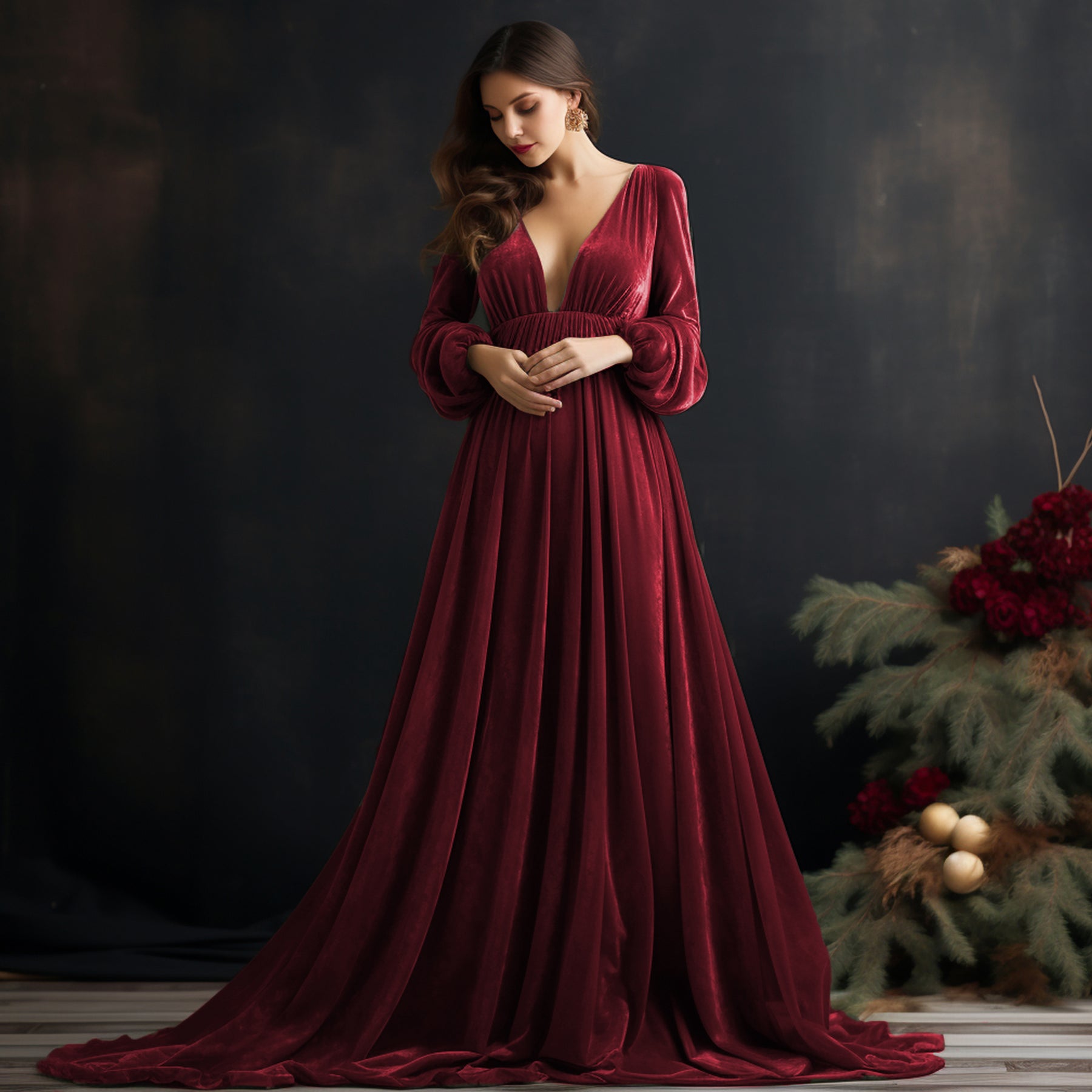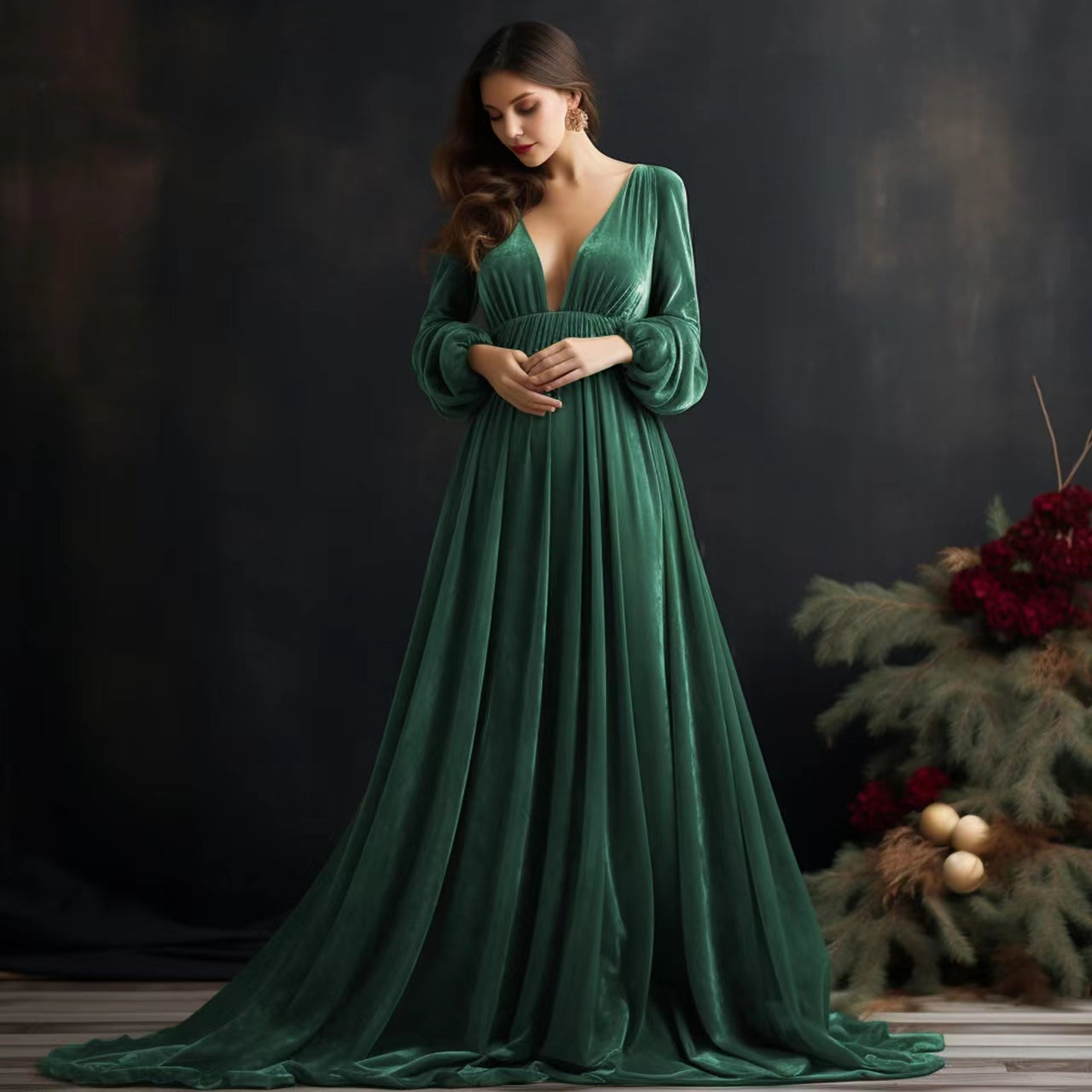 Deep v-neck Christmas Photo Shoot Props Soft Maxi Long Maternity Dress Pregnant Velvet Gown Evening Party for Woman Photography Accessories Baby Shower Gift